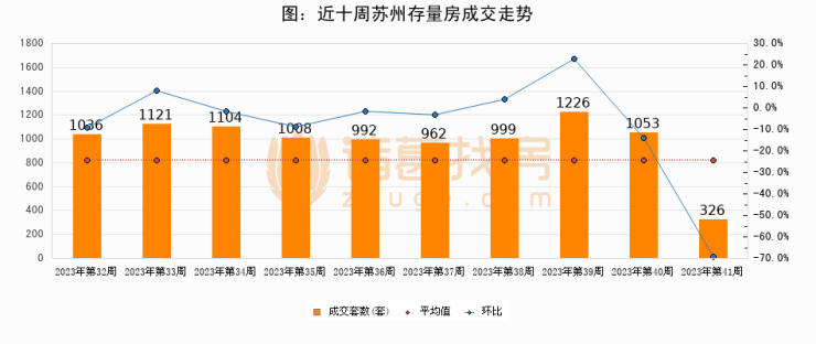 存量房方面,第41周苏州存量房成交326套,较上周减少727套,环比下降69%。从近十周成交走势来看,周均成交套数为982套,本周低于平均水平66.8%。