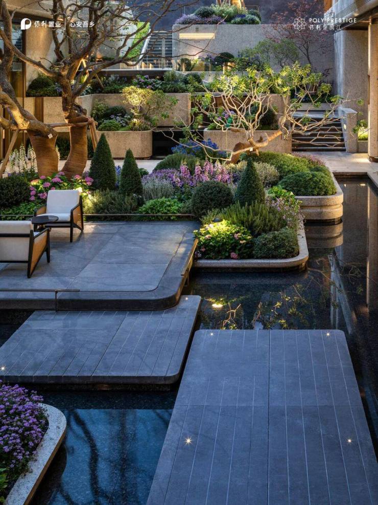 花园内设叠水瀑布与层叠花境,景墙以奢石构筑。