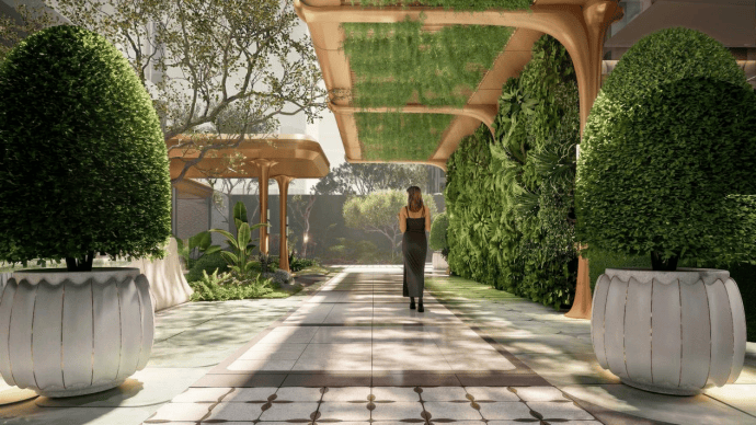 社区将通过入口大门、风雨连廊与架空层灰空间,形成层层递进的景观序列。光影透过廊架洒落,与两侧绿意交织,归家动线在遮蔽与开放之间自然过渡,使行走成为一段富有节奏的花园漫步,形成沉浸式的私密庭园,让归家成为游园体验。