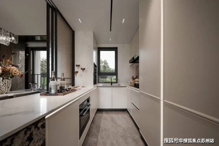 厨房是带岛台交付的U型厨房,厨具品牌为西门子四件套,另外还有双开门冰箱,线性凉霸、科勒单槽。
