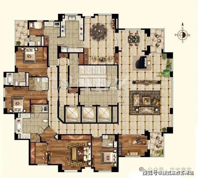 整个户型呈现“回”字型,寓意回家,四周是功能区,中间是三部电梯,其中两部是主人电梯,从东向客户入户,一部阿姨电梯,从西边阿姨间的位置入户。