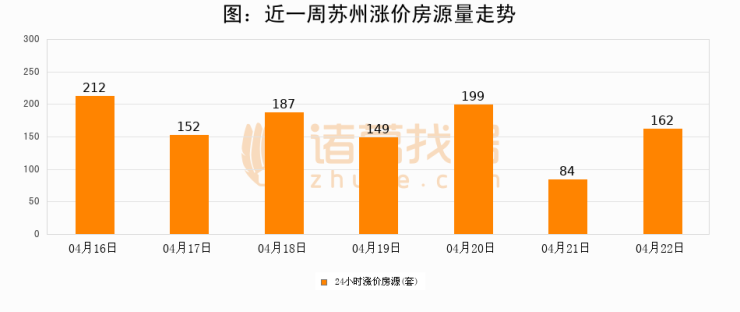 根据诸葛找房数据显示,苏州24小时涨价房源量为162套,较04月21日增加78套,环比上涨92.9%。与此同时,涨价房源占比小幅扩大,业主信心有所提升。