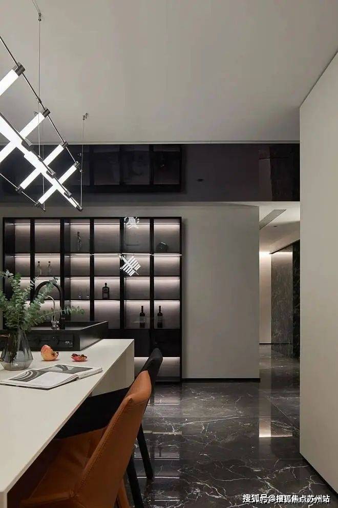 过道处,【爱力蒙特∙黑金帝国石】与木纹砖的巧妙过渡,暖色调的灯光赋予空间沉稳的气质,哑光暗色的柜体力求风格统一,彰显简净高级,恰到好处的场域共鸣,定格了人与空间最佳尺度的平衡。