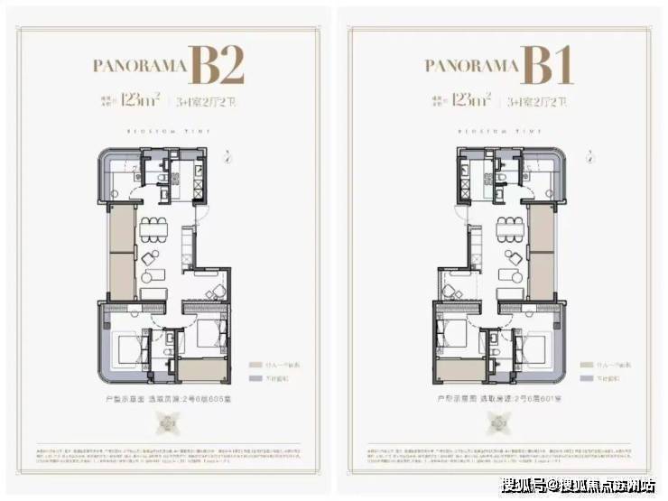 接下来我们来看一下更大的建面约123平户型,预计总价在1550-1690多万, 它采用不同的三阳台设计思路,其中两个阳台放在侧面客厅,客厅面宽约6.6米,最大化地放大采光和视野。