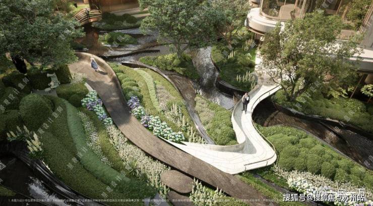 抬板后形成的“新地面层”通过下沉庭院、空中花园等多维绿化系统,使景观从地面向空中渗透。