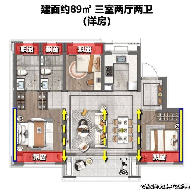整体设计方正,南北通透,拥有约11.2米超阔南向面宽。餐客阳台一体设计,大大提升了空间的视野,看起来明亮宽敞,亲友家人聚会不会显得太局促,同时功能分区明确,也成就了难得的建面约89㎡四开间朝南。全户型5个飘窗,让生活更惬意;充足的收纳设计,日常起居变得井然有序。双卫干湿分离,也为平常盥洗创造了更舒适的使用空间。