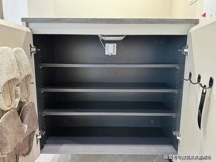 同时,玄关柜的细节打造,也非常亮眼。比如内设除臭机,净化空气;台面人体感应灯带,进门不必打扰家人休息;柜内层板可调节,各种高度的鞋子都能轻松摆下;甚至柜体下方还预留了扫地机器人的位置...