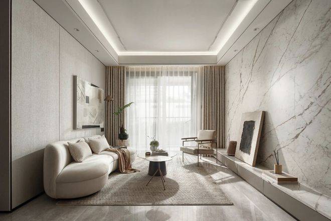 而在硬性标准之上,还充分融合了东方文化高定细节!比如说,客厅整面交付的大面积岩板背景墙均为东方定制款式,采用的是水墨丹青和徽州印象样式,配色风格凸显东方风雅;