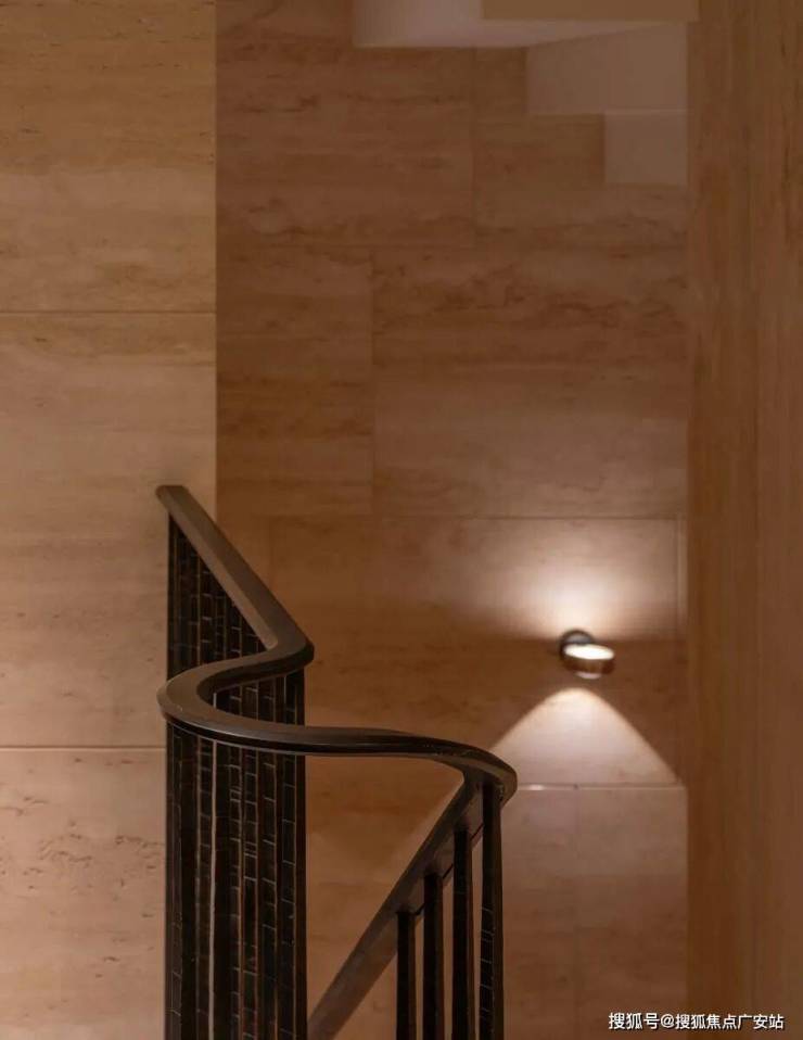 深铜色的栏杆和扶手融合传统与现代语汇,演变出一种当代型态,与现代白色洞石相映成趣,营造出优雅纯粹的意境。