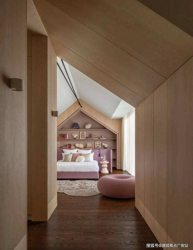 四层阁楼是大女儿的卧室。这里的斜顶启发我们在空间内打造了一个木质小屋;配备私人浴室和衣帽间,还有一个露天阳台,仿佛这充满阳光的一层就是个独立公寓。