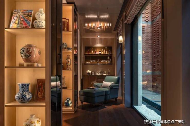 在对角,我们开辟了一面落地窗展示酒窖,展现主人的收藏。温暖的酒窖灯光和壁炉光线映照在白橡木酒架上,为客厅带来温暖舒适的氛围。