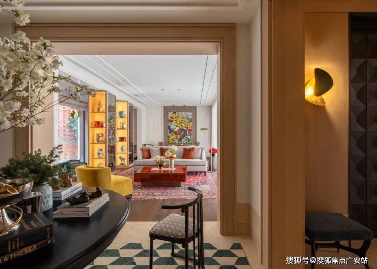 入户空间由一个简约的门厅和楼梯厅组成,门厅配有控制台和嵌入式衣柜。以多功能圆桌为中心的楼梯厅连接着楼梯、电梯、客用卫生间和客厅。空间采用白色洞石搭配特制染色的胡桃木,其浅色调与洞石和谐呼应,同时保留了胡桃木独特的纹理特征。