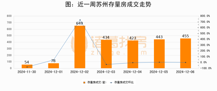 从存量房来看,2024年12月06日苏州存量房单日成交455套,比昨日增加12套,环比上涨2.7%。从近一周存量房成交来看,苏州存量房日均成交套数为362套,12月06日单日成交455套,高于近一周平均水平25.7%。