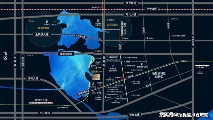 独墅湖科教创新区被誉为国际新“硅谷”,已建成集教育科研、新兴产业、生活配套为一体的现代化新城.区域内相继建设多个科技创新载体,如生物医药产业园、纳米研究所、创意产业园、大学科技园等,包括华为、微软等众多知名大企业入驻.