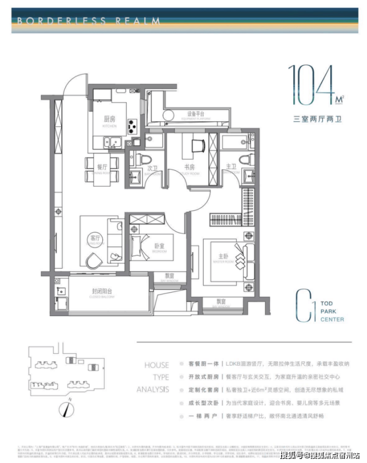 建面约104m²户型特点:LDKB洄游式竖厅+开放式厨房,生活尺度无限拉伸,主卧近6m²灵感空间,承载更多功能可能,成长型的次卧,书房儿童房随心所欲。