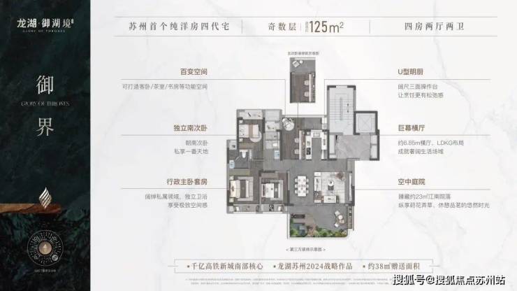 · 建面约 125㎡:四房两厅两卫,约 5.7 米巨幕横厅,南向双套房,赠送约 38㎡。