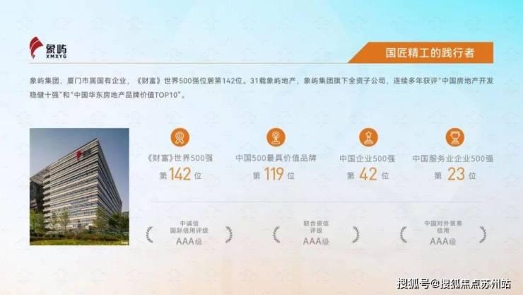 象屿地产,国匠精工的践行者。象屿集团是厦门市属国有企业,在《财富》世界500强中排名第142位。象屿地产作为象屿集团旗下全资子公司,已经深耕长三角核心都市圈31年,是华东地区知名的精品住宅开发商,连续多年获评"中国房地产开发稳健十强"和"中国华东房地产品牌价值TOP10"。2024年上半年,象屿地产位列全国销售金额第30位(操盘),上海市场销售金额第17位(操盘),苏州市场销售金额更是位列第一!这样的开发商,品质自然有保障。