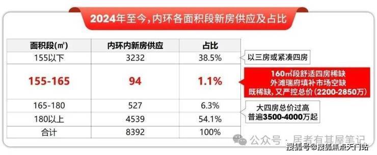 而在总价层面,外滩瑞府也是当下千载难逢的2200-2850万一步到位4房的机会.2024年至今,内环的四房供应起步面积段大约在180㎡,180㎡以上的四房供应占比55%,总价高昂,普遍在3500-4000万左右.