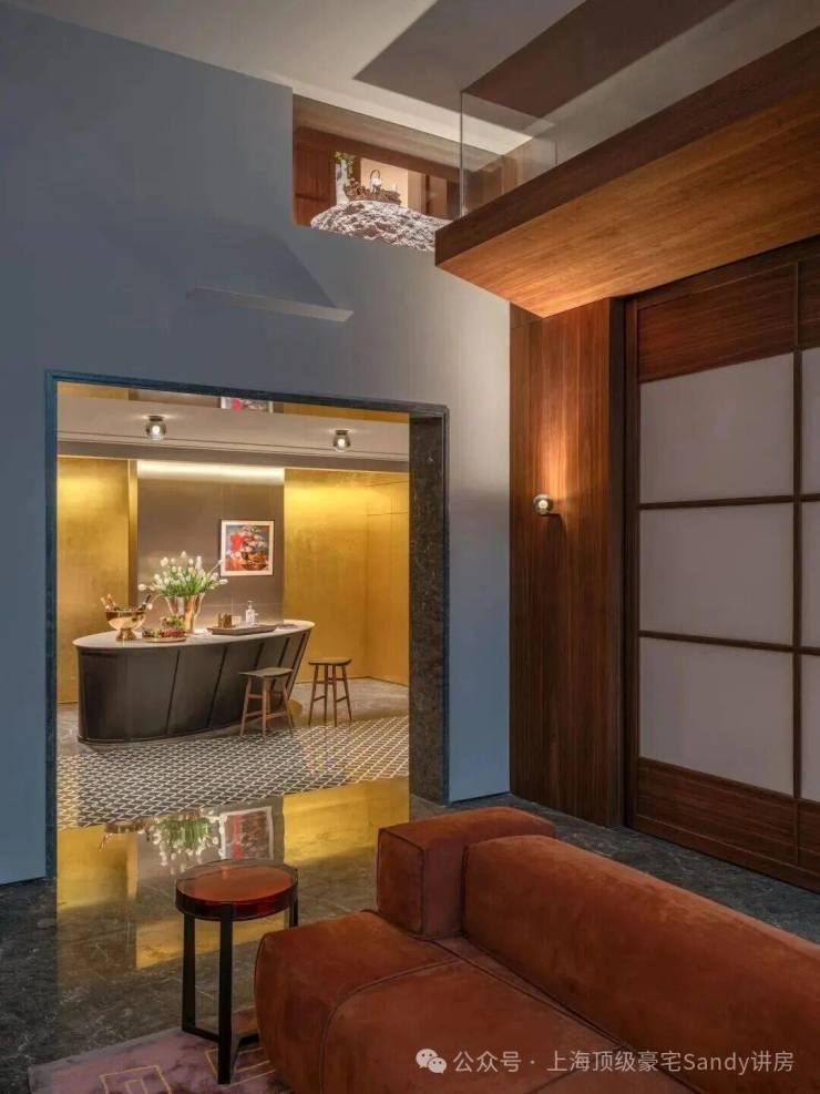 在“木屋”后方,是一个墙面和天花板都覆盖金箔的“水吧”。在这里,我们重新引入了一些当代西方设计语言——大理石地面图案、蛋形吧台和墙面护板细节。这些元素与醒目的红色高光烤漆柜相互平衡。