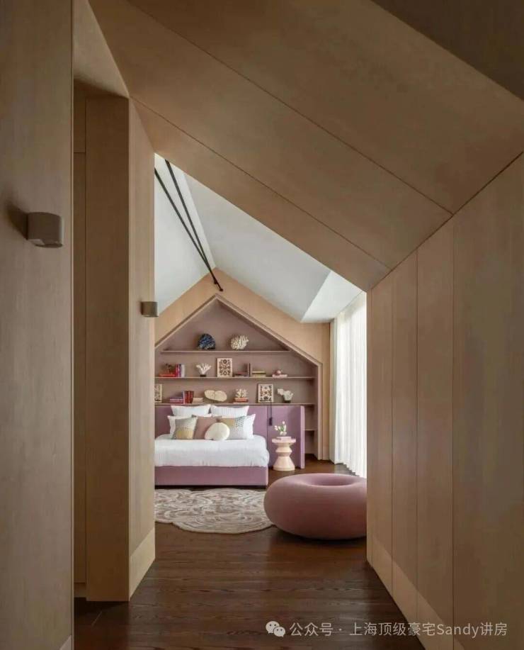 四层阁楼是大女儿的卧室。这里的斜顶启发我们在空间内打造了一个木质小屋;配备私人浴室和衣帽间,还有一个露天阳台,仿佛这充满阳光的一层就是个独立公寓。