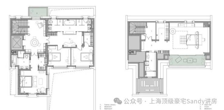 二层设有儿童区和父母房间。所有房间都围绕庭院布置,以充分利用景观视野。我们还将楼梯厅空间改造成家庭图书馆——在这个原本私密的楼层创造了一个公共空间。这为家庭成员增加了除客厅和地下室之外的又一互动空间,强化了我们对现代上海家庭——更多交通和爱的理念。