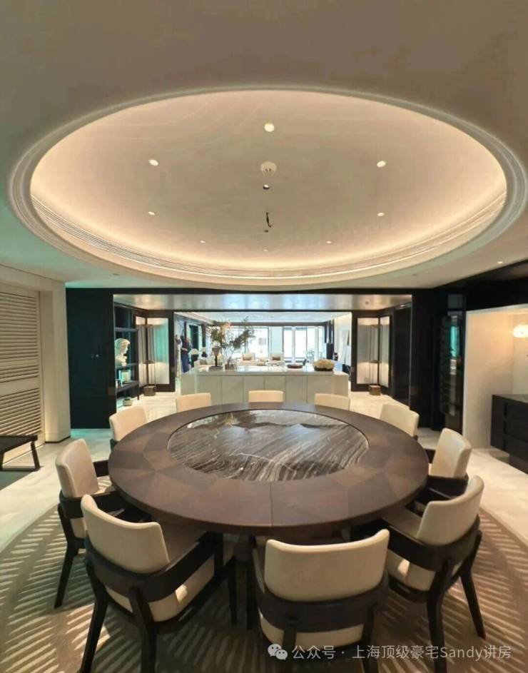 约270度三面环幕式开窗,打通阳台、客厅、餐厅与厨房,形成约19.1米南向与22.1米东向的超宽视野面宽。空间如画轴展开,面朝陆家嘴天际线,营造如剧场般的奢阔视觉感受。