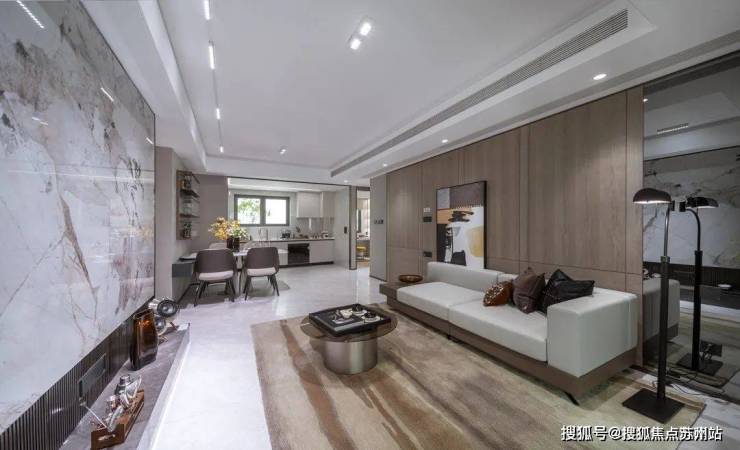 客厅背景墙岩板,客厅采用金属踢脚线,提升整体质感;