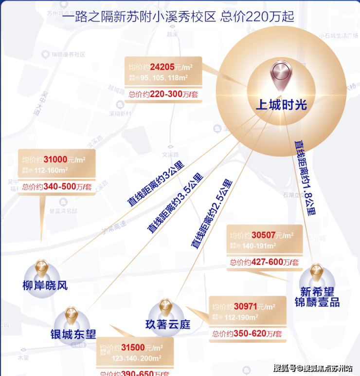 上城时光择址越溪主城与太湖新城交汇的核芯位置,凭借一线太湖新城板块的地段优势,拥享醇熟主城价值的再次飞跃;一路之隔太湖新城新房均价约31000元/㎡,主力总价段约350万;上城时光2公里范围内新房差价便宜约6000-8000元/㎡,性价比高。