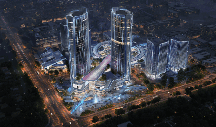 双子塔在建筑空间设计上突出自身的特色,增加了都市魅力提高空间辨识度,塑造城市门户形象。围绕双子塔地标还将打造鳞次栉比的建筑群体,包含28万方的大型区域商业综合体、5星级酒店等,展现金鼎高度的同时带来高品质的商业、商务配套。