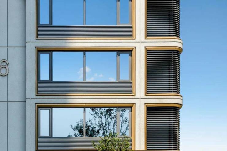 在外立面上,项目南向铝板、局部金属格栅、部分涂料等,还是经典9号库金色,同源滨江海岸系的金色铝板,颜值较高。