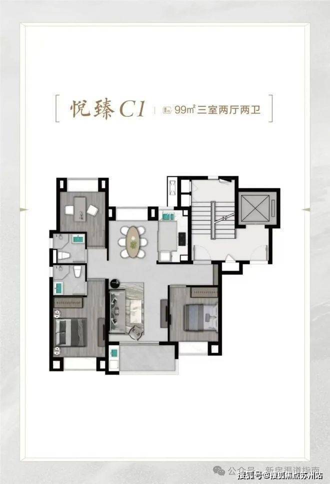99平户型是主流飞机户型,三开间朝南,洋房得房率相当高,客厅窗外可以看到楼栋距很宽,中央空调、地暖也配齐了。