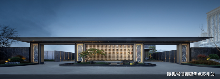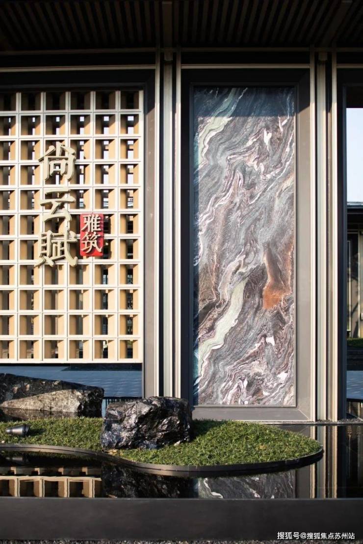 平檐若飞是财富的象征,无限延展的屋角也有不断晋阶人生的寓意,精美金属格栅搭配保利专利材质——东方云纹岩板,远处看去像一顶官帽,犹如高门之内皆王侯的象征,大气非凡,中国千年的传统审美尽数昭然。