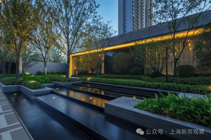 归家动线设置上,业主先穿过酒店式的落客大堂,大堂内设有迎宾待客区,穿过大堂,有灵动水景、景石进入幽静的园林之中。层层递进从喧嚣到静谧、让归家充满了仪式感。