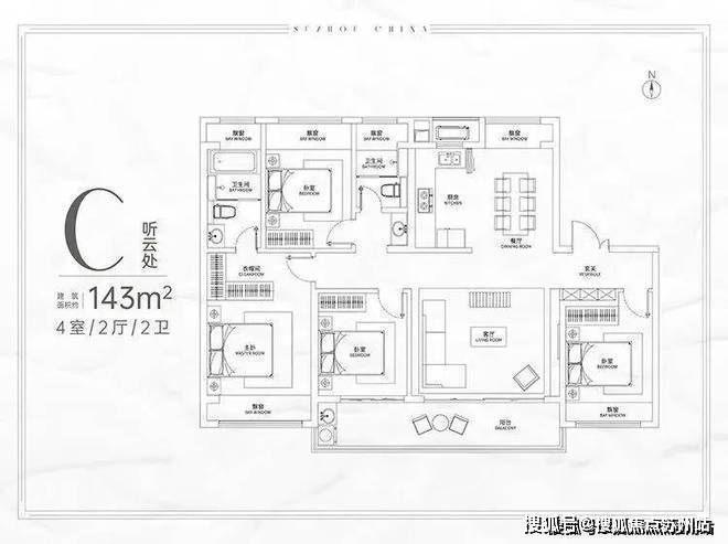 南向四开间,约5.1米大横厅,连接约8.1米阳台。主卧套房设计,带步入式衣帽间和明卫,6个飘窗设计。