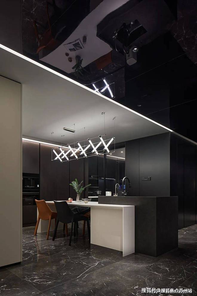 与客厅相比,餐厅对黑色的运用更为多元。设计师巧妙地运用不同材质,吊灯与精致器皿相得益彰,一幅城市墨画定格了时间,伴随着富有格调的三餐四季。