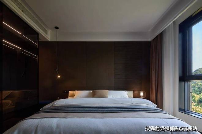 艺术感不仅体现在空间环境的营造,细节的处理和材质的选择也透漏出时尚气息。大气中又不失生活的趣味。皮质有纹理的软包,无主灯的设计,每一处细节都体现着轻奢感。地毯、床品和吊灯的相互映衬,营造出自然舒适的空间氛围,增添了卧室的温暖气息。