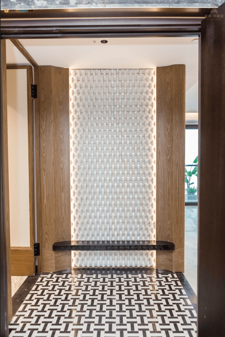 样板间进门后,映入眼帘的是陶瓷的编织纹玄关背景墙,极具质感和尊贵感.