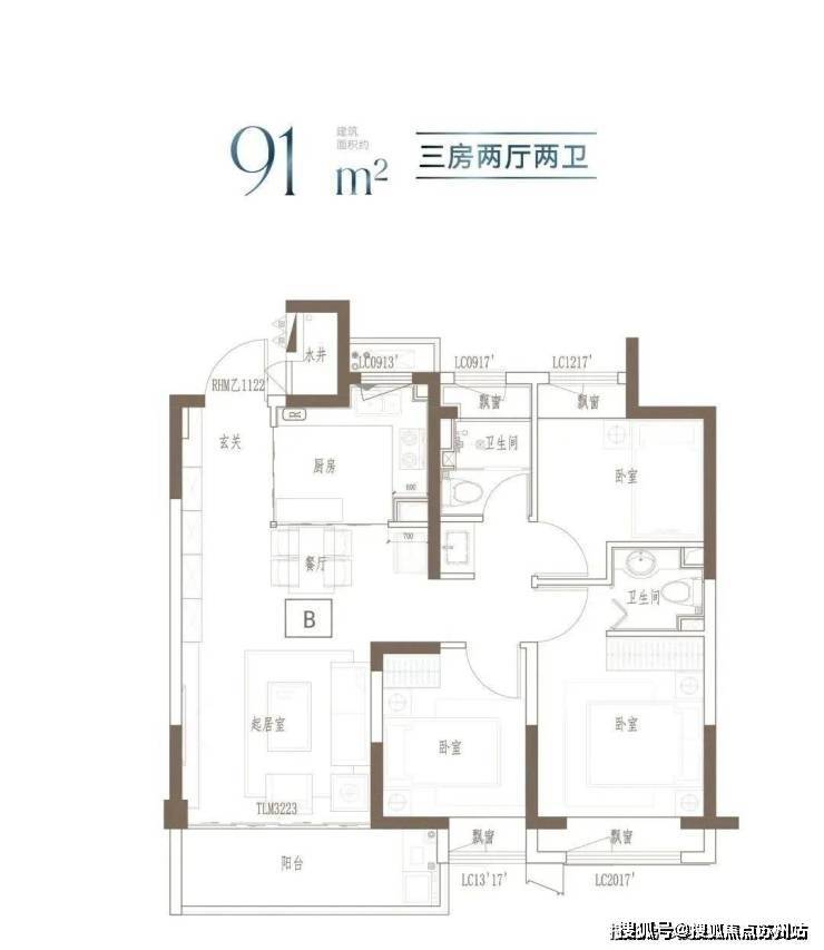 建面约91m²的这个户型,3开间朝南,全屋阳光充足;L型厨房转角移门设计,最大化空间视野;四飘窗设计,通透空间享受;动静分区,亲密有度;套房式主卧,容纳私谧生活点滴。