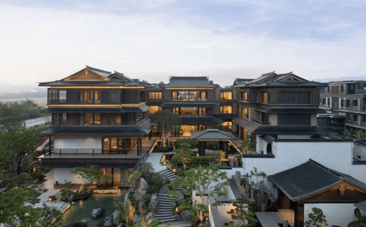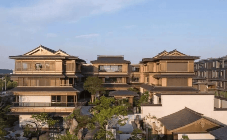 屋顶延续了宋代建筑歇山顶的大基调, 同时又依据各单体的落位形态及综合关系做了多样变化,如抱夏式屋顶、L形顶。 屋脊采用正脊的形式, 取消了传统戗角装饰和鸱吻的符号,脊头呈起翘的姿态,用鎏金边勾勒出细腻的轮廓。 搜建筑