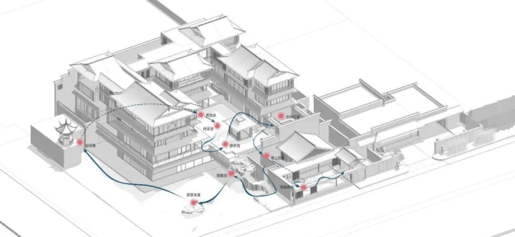 尤为不同的是, 设计还通过整体抬升的方式设置了一处悬于首层之上的庭院, 远处各个不同空间的景被“借入”到这个立体庭园中,荷花池中央的亭台成为了观景的看台。整条游览路线在经过遮隐、转折、抬升、停顿、远眺的一系列操作后,达到最终的高潮。