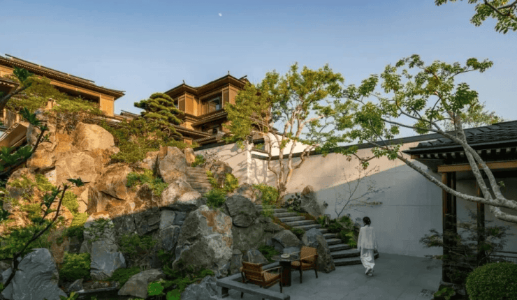 藉由此, 设计以中国古典园林狮子林为原型,在22#“泉香”构筑出了一处回环曲折、层次深奥,以水为主题的“层叠游园”式官邸大宅, 立体化呈现园林空间的曲直、疏密、幽旷,以期达到“游目足以骋怀”的效果。 走入其中,三种递进景别层次:湘湖的群山大湖为远景,庭院飞瀑与巍峨建筑为中景,山水松石为近景。