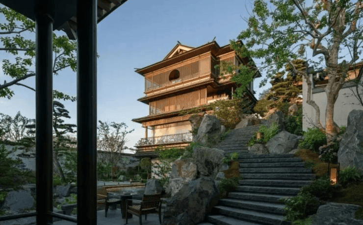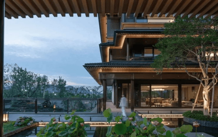 山水是地上之文章。 如果将园林的整体营建看作一首诗,那么园林建筑就是诗中的“诗眼”。“泉香”取形于传统的宫殿高台,意随宋风,四层楼高的楼阁平作式建筑整体呈现一种纯和之气、简约之美。 建筑主体下方是稳重的基座,上部采用重檐叠顶形成高阁意象。虽然装饰减少,但线条偏硬朗,形体比例更加舒展,艺术风格也更加细致、清新与灵动,且更符合杭州历史文化与现代人的审美取向。