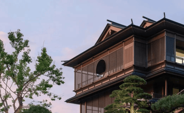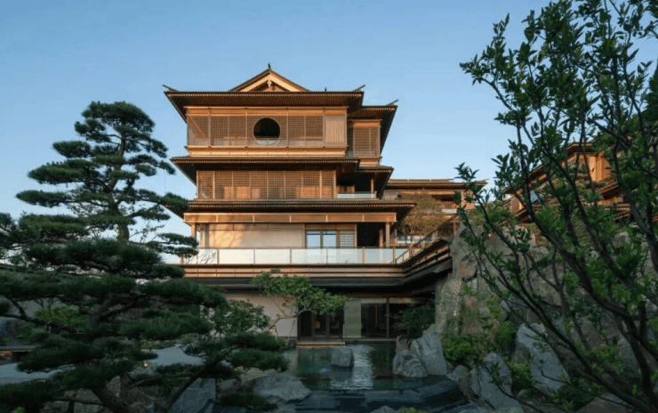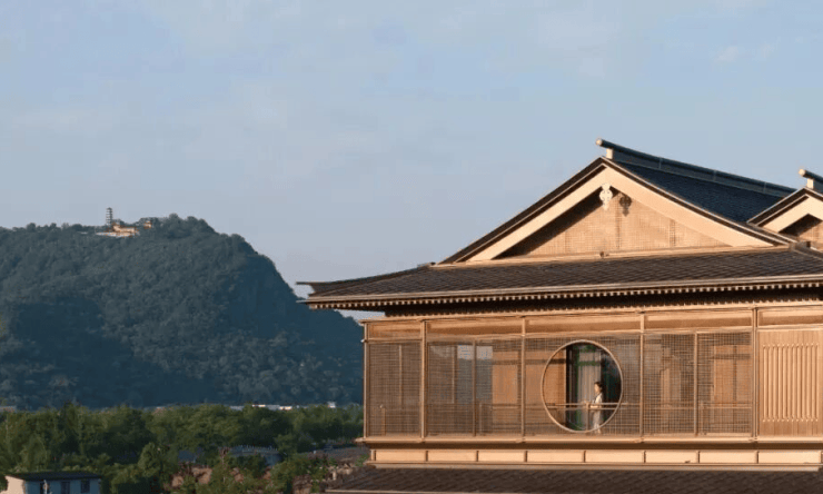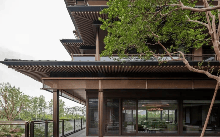 屋面曲线延续了宋代举折构造形式,整体更为轻薄现代。 整个建筑立面也不再是厚重的墙体结构,大块面通透落地玻璃窗被木色金属格栅包裹,有韵律地竖向划分成屏风式条块,这使得建筑形体的表达更为简洁,整体呈现一种更为简约的轻盈感。
