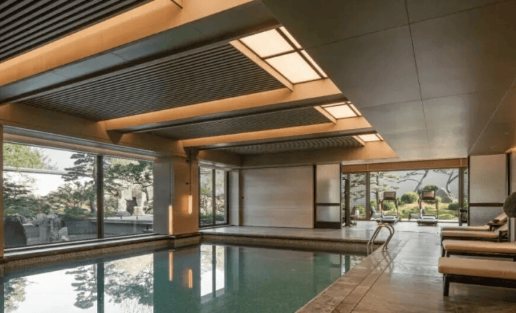 从室内泳池朝外看去,园内水体聚中有分,动态的水和静态的山石带来独特的观感,一幅幅自然画作成为大面幅落地玻璃前“隐藏” 的背景。 搜建筑