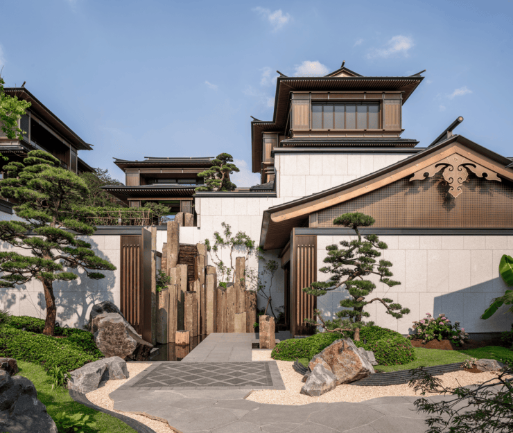 落笔之处,首先是对于建筑形制的判断。 考虑到项目面积之极、售价之极、产品之盛放眼杭州乃至全国亦是无出其右,因此凸显湖山之隐、家族之贵逐渐成为设计思考构建官邸大宅之初的顶层逻辑。 在这个过程中,提取刘庄、汪庄、郭庄、蒋庄四座“中国名庄”的在地性文化叙事,便是对杭州这座原本便有着浓厚江南底蕴之城文化层面的回应。