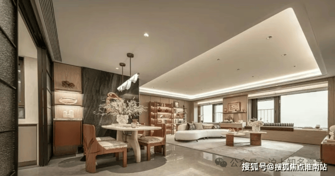 稍微走近一点,就能看到采用了大量的弧形元素和石材材料!石材的质感本身就厚重,在上面叠加类似海浪的线条弱化了厚重感,反而显得轻盈!