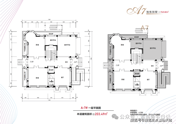 布局:地上三层(4.5米层高)+地下一层(6.2米层高)+900㎡花园