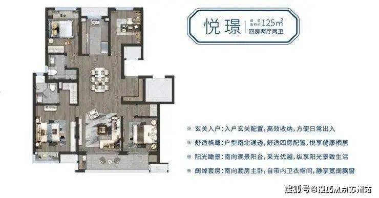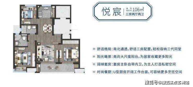 项目共推出两种户型,建面约106平米的三房两厅两卫和建面约125平米四房两厅两卫,均为精装修交付。建面106平米的三房户型,布局紧凑,功能齐全,适合三口之家;建面125平米的四房户型,空间阔绰,南北通透,适合二胎家庭或三代同堂。