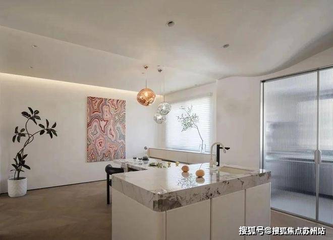 空间与光线的友谊沿着极简走向无尽。嵌入式厨电,使得布局更加开阔明了,将突兀二字尽数抹去。泼墨大理石台面由几抹亮色点缀,奢雅之中巧露活泼生动。