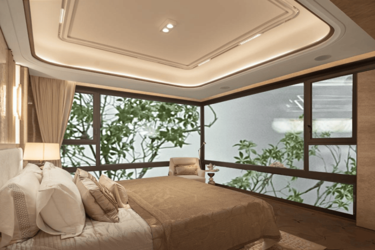 奢石材质与升级定制体系上,主卧标配约4.6米超大面宽贝母马赛克弧形皮革背景墙,地面采用和保利世博天悦顶豪项目同款的嵌铜荷叶拼地板,每一处细节都拉满顶豪质感。
